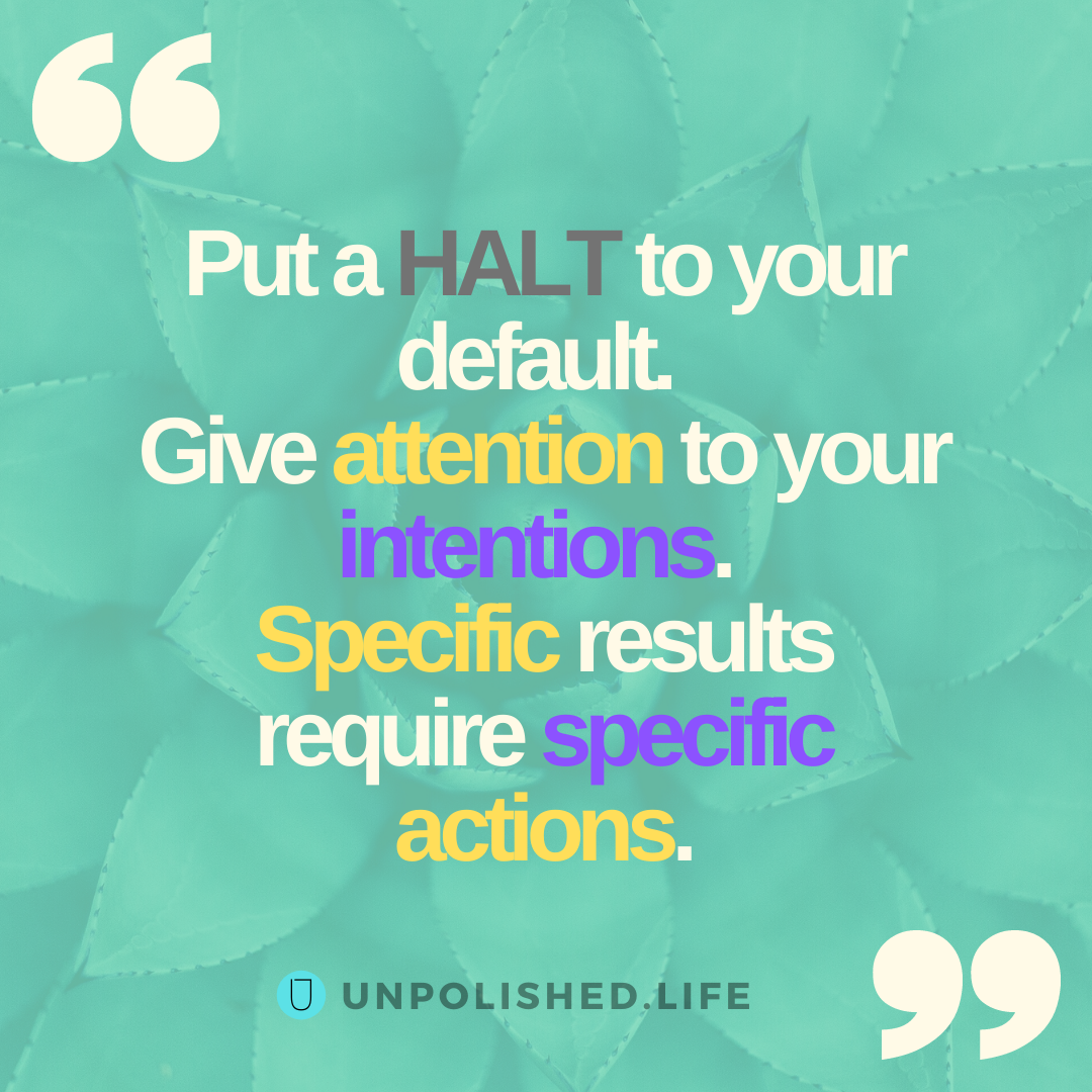 I’m not saying we or I want to live every aspect our lives this way. No, that’s no fun! However, if there’s something you want that you haven’t given this kind of attention to, then the real reason you don’t have it is because you haven’t put a HALT to the default. Without attention to your intention, you WILL, by default, wander into the same old weeds, the same old procrastination, only peering through the clutter at your goal in the far off distance, only because you neglected the tools and details right here, in you, at your disposal, if you will just make a plan.